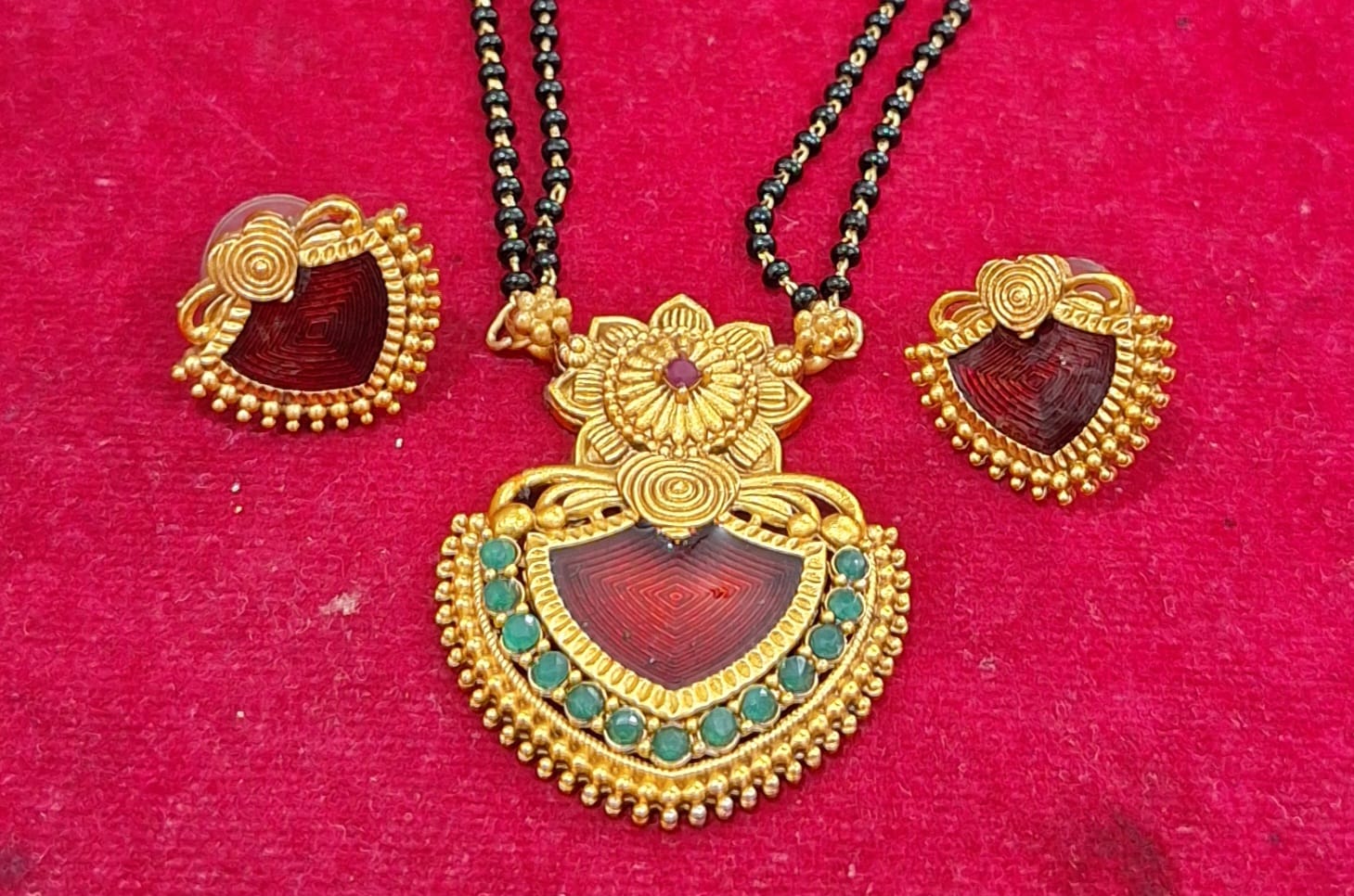 Size:The pendant is medium-sized with a dual black-beaded mangalsutra chain, and matching earrings (approx. 2–3 cm).