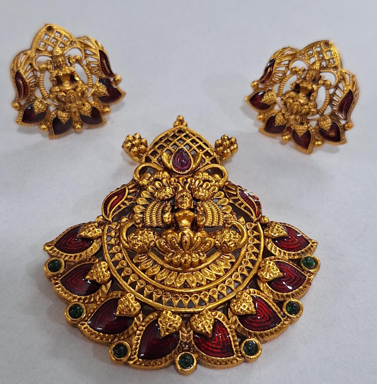 Add a royal traditional touch to your look with this beautifully crafted antique temple jewellery set. Featuring a detailed Goddess Lakshmi motif, rich red enamel petals, and elegant green stone highlights, this set is perfect for sarees, lehengas, and festive outfits. A timeless piece that blends heritage design with modern elegance.
