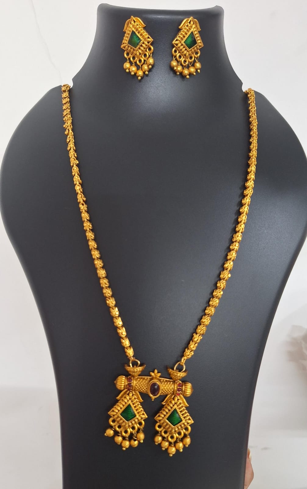 This exquisite antique-finish necklace set features intricate temple-style craftsmanship with detailed gold-toned work. The centerpiece is adorned with rich green enamel accents and a bold stone in the center, giving it a royal and festive look. Paired with matching statement earrings, this set is perfect for weddings, cultural events, and traditional outfits.