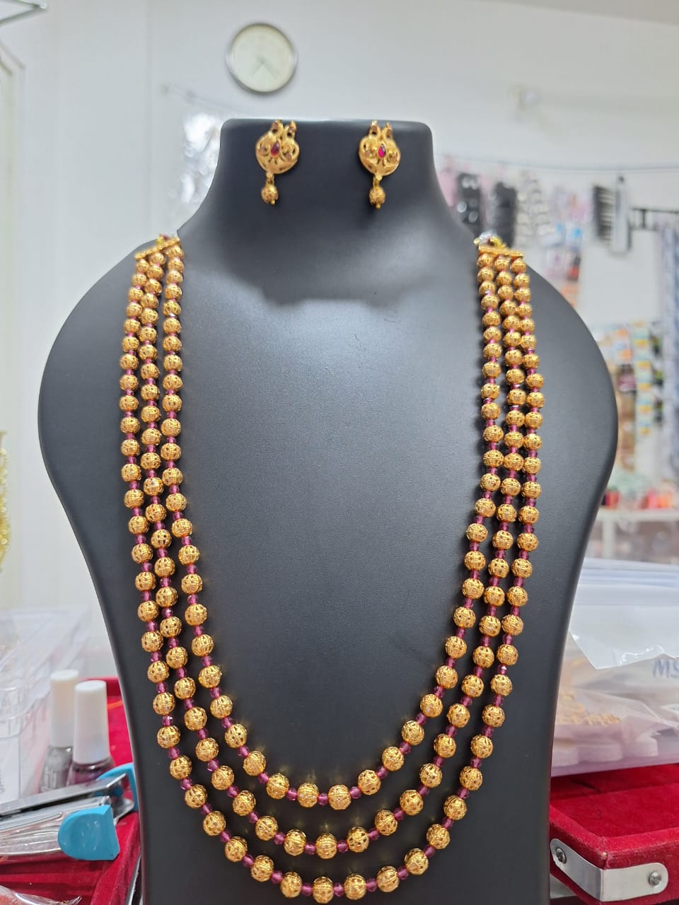 Material: Gold-tone embossed alloy beads with ruby-toned spacer beads and stone-studded earrings